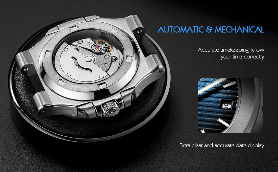 • Self-Winding Automatic Movement:Powered by the motion of your arm, this automatic watch features a sophisticated mechanical movement with over 110 intricately moving parts and 20 jeweled movements. With its exhibition case back, you can see the fine craftsmanship in action. No battery required — it winds automatically or can be manually wound via the crown to keep you on time