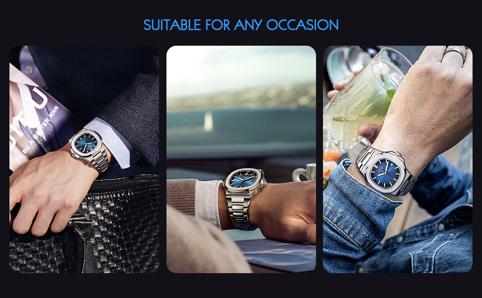 • Durable Stainless Steel:Crafted from high-quality stainless steel, it offers durability and strength while maintaining a sophisticated appearance. Whether you're dressing up for a formal event or down for a casual outing, this blue watch is built to last